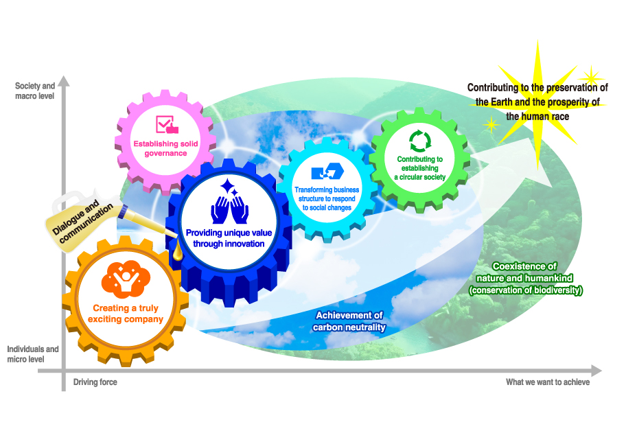 A circular society refers to a society in which limited resources are utilized to the maximum extent and environmental impacts are minimized by, for example, promoting recycling and reducing waste. Transforming the business structure by bringing innovation into the production of products and services will contribute to establishing a circular society, and this will in turn help realize our corporate philosophy.