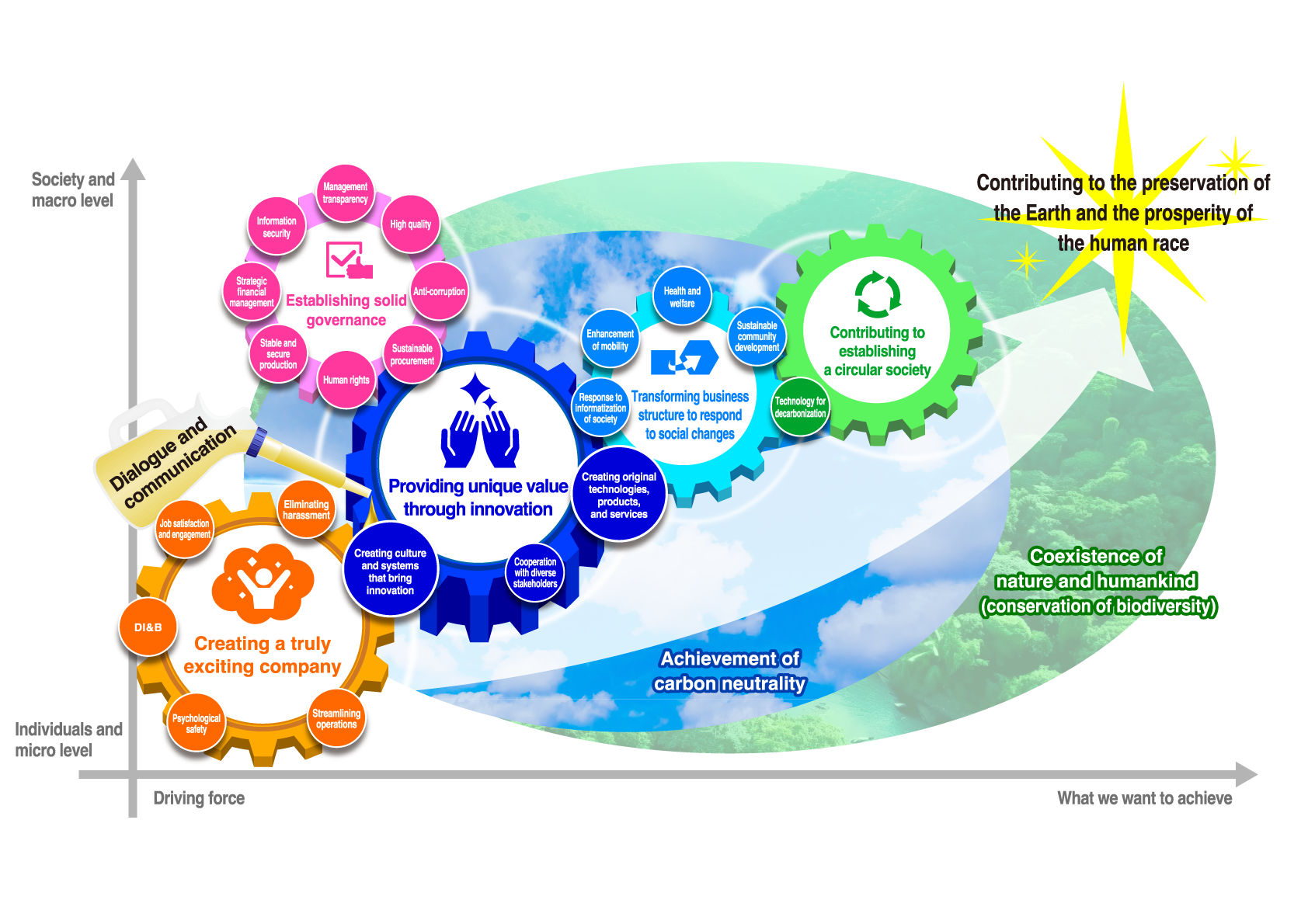 | Customers | We will provide safe, reliable, high-quality products and services that earn customer trust. Moreover, through communication with customers, we will develop products and services that contribute to meeting their challenges, and collaborate to develop sustainable products that satisfy the diverse requirements and expectations of the global market. |