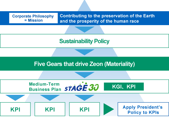 Based on the concept of the Five Gears that drive Zeon, we have set various KPIs and implemented initiatives in the Medium-Term Business Plan: STAGE30.